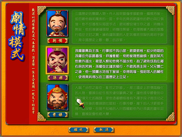 正常來說,一開始我們都要先體驗劇情模式,劇情模式的難度也是隨著關(guān)卡的遞增,難度也隨著遞增,劇情模式開始有3個勢力選擇,分別為曹操(魏)、劉備(蜀)、孫權(quán)(吳),主公不同,獲得的特性也不容,比如孫權(quán)第一關(guān)卡的主公特性是買東西可以打折。