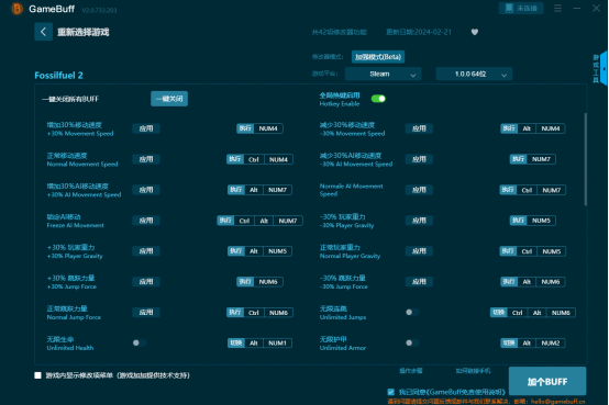 當然在玩游戲時,有時候我們可能會遇到一些難以克服的難關(guān)。這時候,使用GameBuff修改器將是一個解決問題的好辦法。如果你正在玩Fossilfuel 2,那么使用Fossilfuel 2修改器來增加30%移動速度、鎖定AI移動、正常跳躍力量、無限生命、無限氧氣等功能,可以幫助你更輕松地完成游戲任務,同時GameBuff修改器還支持上千款單機游戲的修改,可以讓你不懼游戲中的任何困難關(guān)卡。