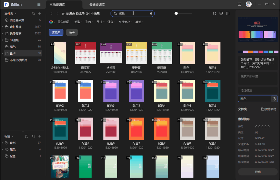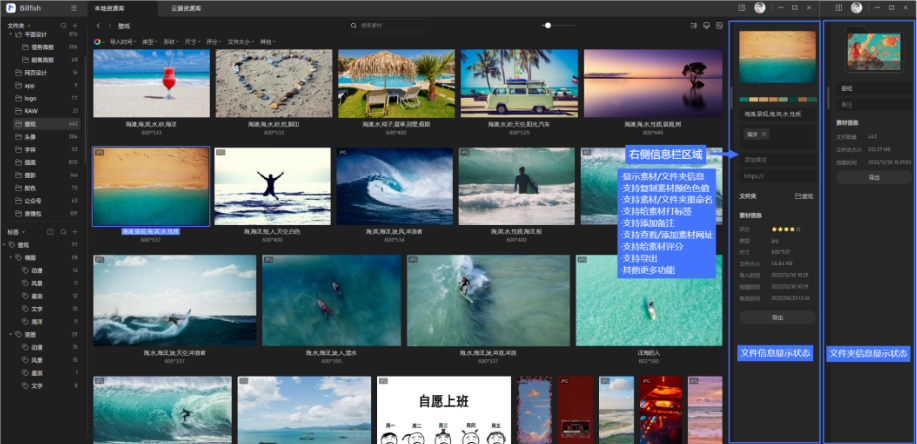 Billfish是一款圖片收藏及管理工具,它不僅可以高效收藏和整理各種圖片、截圖等,而且查找非常方便,協(xié)同功能強大,操作體驗超群,支持Windows/macOS系統(tǒng)。它是一個線下本地的專業(yè)素材管理軟件,安全穩(wěn)定!滿足素材管理的各種需求,無論靈感收藏,內容整理還是素材應用等,都可以輕松搞定。