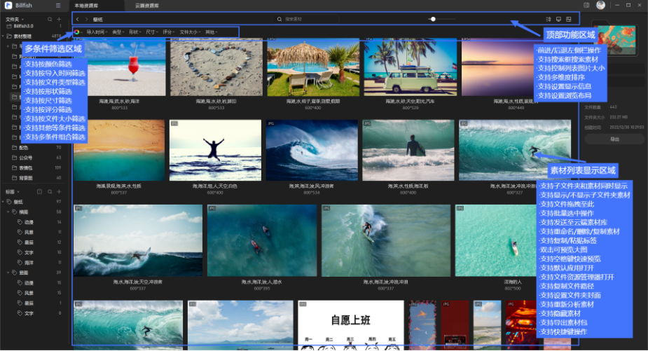 Billfish提供多維度的排序依據(jù)讓用戶自定義排序,充分的利用好素材的各種信息,更快更輕松的查看自己的素材。