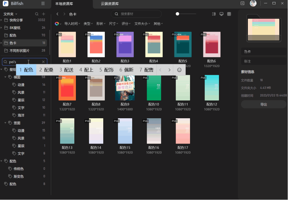 您也可以通過篩選欄的相關功能來快速查找,目前支持【顏色、形狀、導入時間、類型、尺寸、評分、文件大小】等維度。