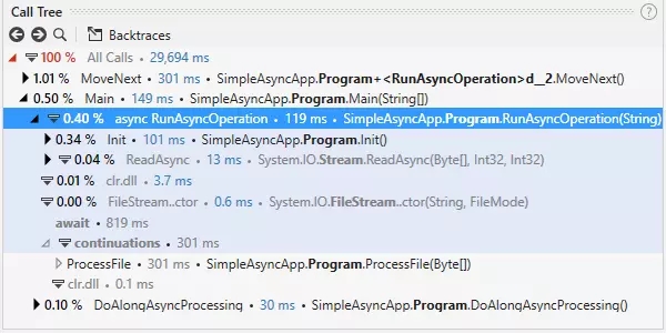 dotTrace 使您可以輕松分析異步代碼:async 調(diào)用的所有“部分”都在一個(gè)地方顯示,因此您不必在不同的調(diào)用堆棧中搜索它們。