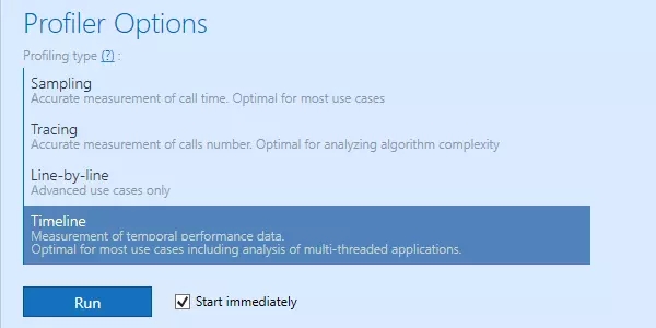 根據(jù)您選擇的類型,可以以不同方式對(duì)應(yīng)用程序進(jìn)行概要分析。主要是,您需要指定相應(yīng)的應(yīng)用程序,從列表中選擇一個(gè)分析類型,然后單擊“運(yùn)行”按鈕。更重要的是,可以通過從應(yīng)用程序類型下的列表中選擇它來附加到進(jìn)程。