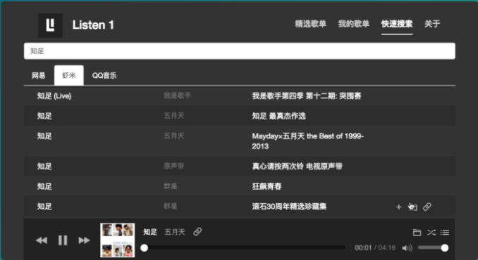 Listen 1是一款可以搜索和播放:網(wǎng)易云音樂,QQ音樂,酷狗音樂,酷我音樂,Bilibili,咪咕音樂網(wǎng)站的歌曲,使你的曲庫更全面,讓你不必再為了聽幾首歌而下好幾個(gè)音樂軟件。 還支持歌單功能,你可以方便的播放,收藏和創(chuàng)建自己的歌單。并且Listen 1還是一個(gè)開源項(xiàng)目,在Github上開源,因此不必?fù)?dān)心軟件不可用或軟件安全問題。