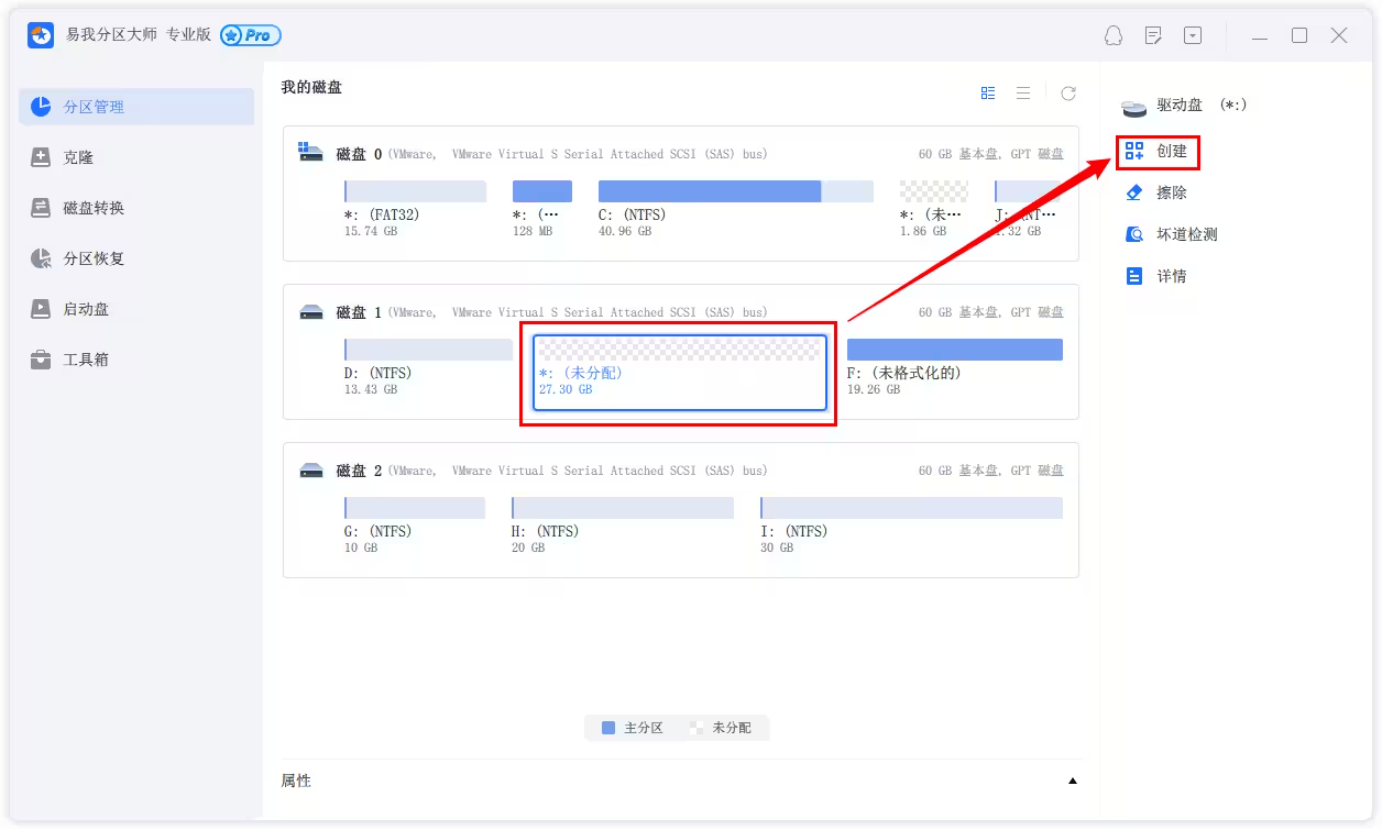 選中磁盤上的未分配空間,在右側(cè)功能列表中選擇【創(chuàng)建】。