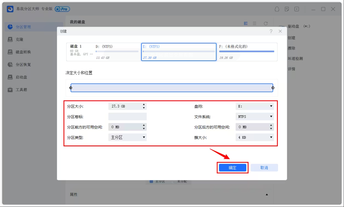 在彈出的【創(chuàng)建】窗口中,設(shè)置“分區(qū)大小”、“盤符”、“文件系統(tǒng)”和“分區(qū)類型”等信息。設(shè)置完成之后,點擊【確定】。