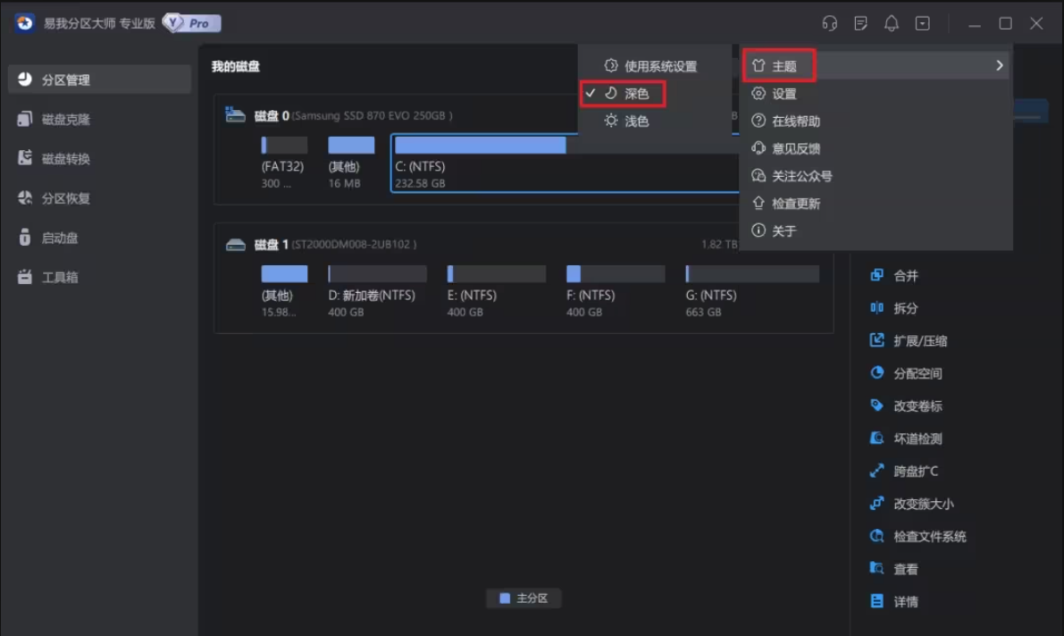易我分區(qū)大師深色模式是一種在暗色背景下使用淺色文字和圖形的界面風(fēng)格,相比傳統(tǒng)的亮色界面,對眼睛的負(fù)擔(dān)也較小。用戶可以根據(jù)自己的喜好選擇深色模式或淺色模式,以獲得更好的使用體驗。
