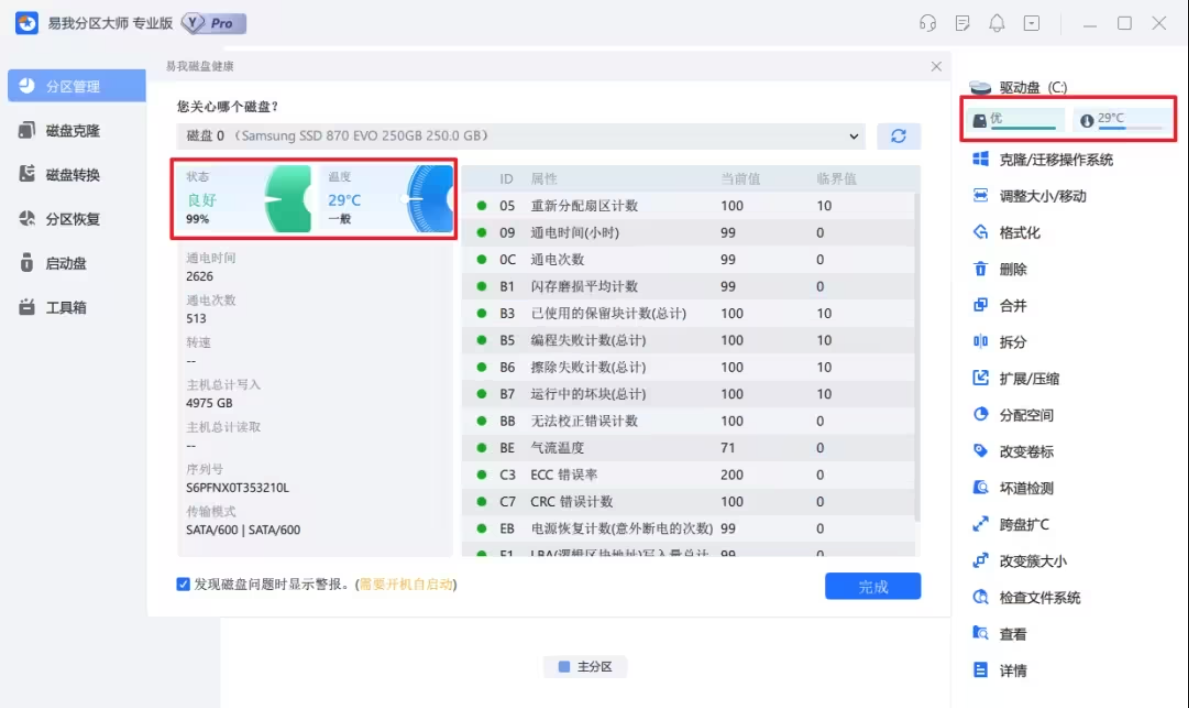 易我分區(qū)大師提供了磁盤健康檢測功能,可以幫助用戶了解磁盤的狀態(tài)和性能,包括檢查磁盤的S.M.A.R.T.狀態(tài)、壞扇區(qū)、讀取錯誤等信息,從而更好地管理磁盤和保護數(shù)據(jù)安全。