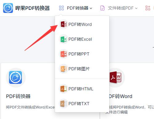 1.打開嗶果PDF轉(zhuǎn)換器,點(diǎn)擊頂部導(dǎo)航欄中的PDF轉(zhuǎn)換器,在下拉選項(xiàng)下選擇“PDF轉(zhuǎn)Word”選項(xiàng);