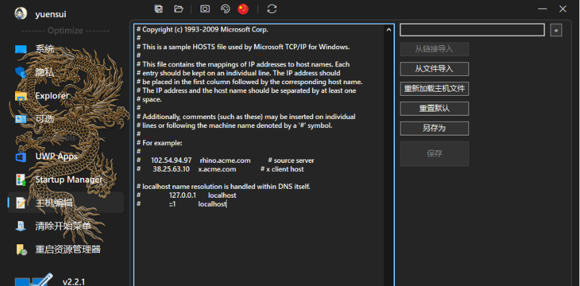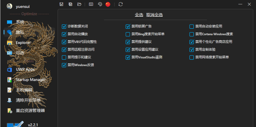 WinTune是一款免費無廣告、綠色免安裝的系統(tǒng)優(yōu)化軟件。功能有系統(tǒng)優(yōu)化,隱私優(yōu)化,hosts編輯,uwp應(yīng)用管理等等,支持win10以上、支持簡體中文,支持配置文件導(dǎo)出導(dǎo)入【使用前可以導(dǎo)出配置文件,必要時可以導(dǎo)入恢復(fù)】。