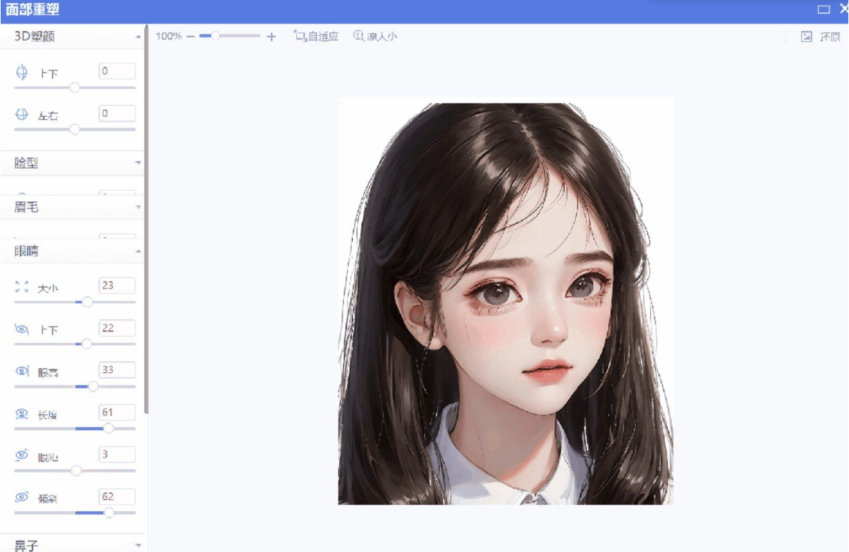 以眼睛為例,如果眼睛小可以在“大小”處里把眼睛拉大一點,還可以調(diào)節(jié)眼睛的上下、眼高、長度、眼距、傾斜度,調(diào)節(jié)后的圖片非常完美,完全沒有違和感。