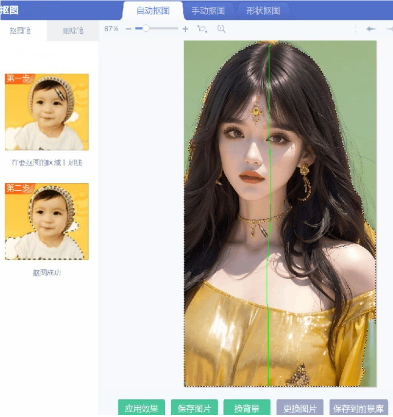 摳圖:摳圖分為自動摳圖、手動摳圖、形狀摳圖和AI摳圖,其中自動摳圖只要把要摳的圖往下劃即可完全摳圖,非常智能方便。