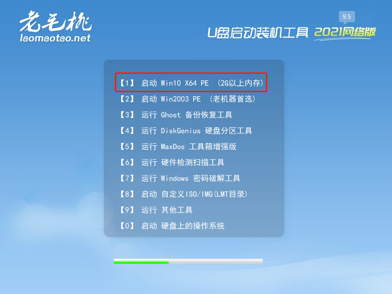 第三步進(jìn)入老毛桃winpe界面后,通過(guò)“↑↓”鍵選擇“【1】啟動(dòng)Win10 X64PE(2G以上內(nèi)存)”
