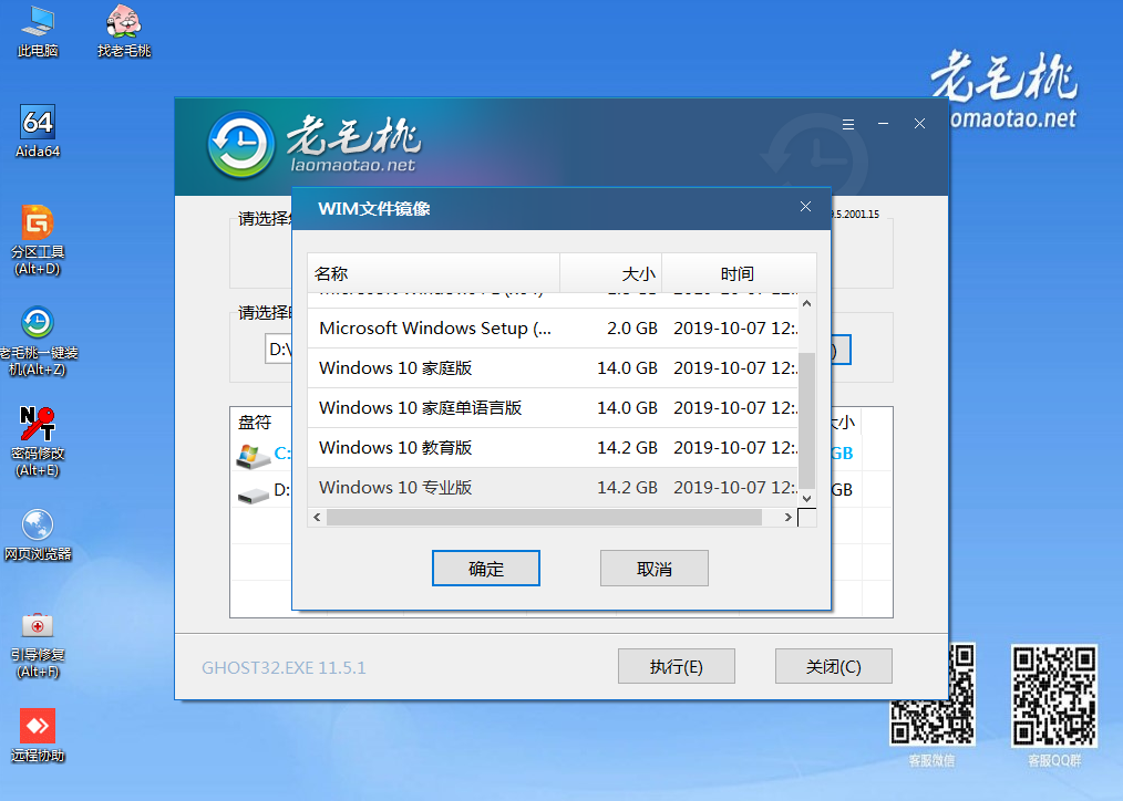 第四步選擇U盤里面準(zhǔn)備的ISO鏡像文件安裝,參考下圖:選擇windows10專業(yè)版點(diǎn)擊“確定”,再點(diǎn)擊“執(zhí)行”在老毛桃一鍵還原窗口