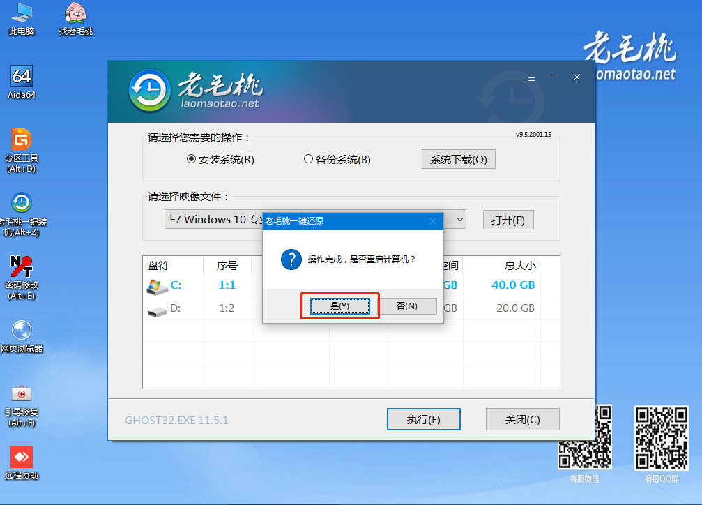 第六步程序?qū)懭氪惭b完畢后點(diǎn)擊 “是” 重啟筆記本,同時(shí)要拔掉U盤以免再次進(jìn)入老毛桃winpe界面了