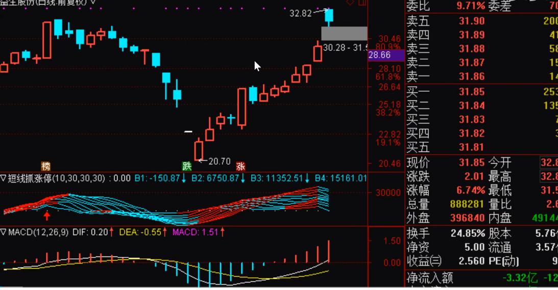 MACD指標(biāo)是一種趨勢跟蹤的動量指標(biāo),它可以用于判斷股票的短期趨勢。當(dāng)MACD線上穿信號線時,這是買入的信號;當(dāng)MACD線下穿信號線時,這是賣出的信號。