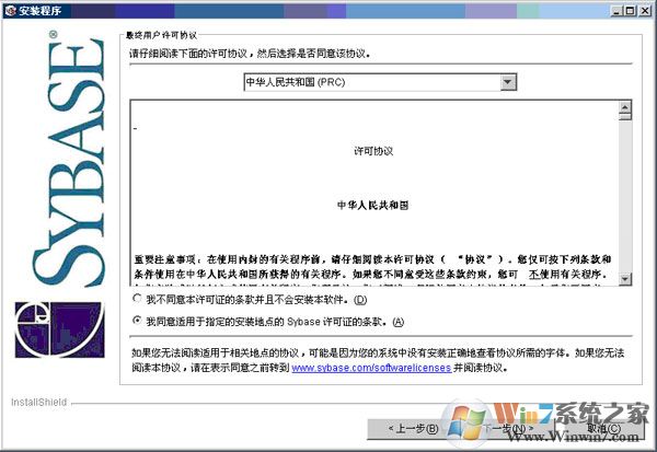 4、選擇“中華人民共和國(prc)”,這里如果你英文好,你也可以選擇安裝英文版的,在選擇“我同意適用于指定的安裝地點的Sybase許可證條款”,然后在點擊“下一步”進行安裝,如圖: