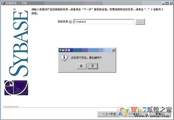 6、點擊“下一步”安裝的時候提示不存在該目錄,問是否要創(chuàng)建“sybase”安裝目錄。你只點擊“是”,就可以自動創(chuàng)建“sybase”目錄,如圖: