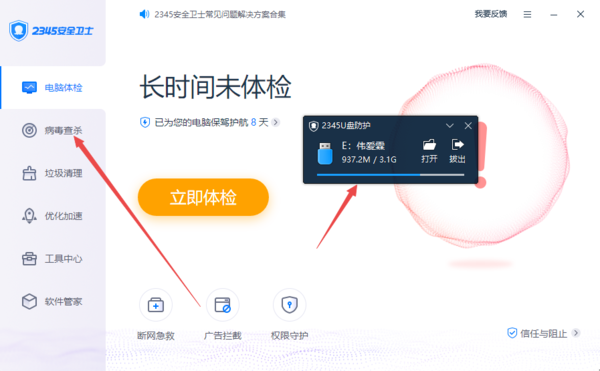 第一步,將U盤插入電腦,然后啟動2345安全衛(wèi)士,接著點擊左側列表中的【病毒查殺】功能。