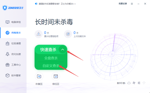 第二步,接著在右側的界面中,點擊【快速查找】按鈕右側的下拉箭頭,然后點擊【自定義查殺】選項。