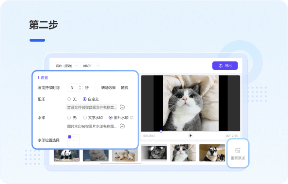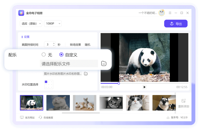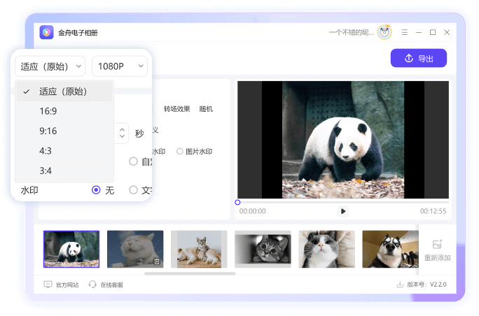 支持自由添加背景音樂(lè),可以根據(jù)自身喜好添加任意想要的背景音樂(lè),支持一鍵添加水印,可添加文字水印、圖片水印,添加位置可根據(jù)喜好自由設(shè)置,快來(lái)制作您的專屬電子相冊(cè)視頻吧!