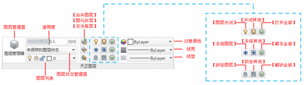 新版界面中提供了全新的圖層管理器,依然將天正圖層標(biāo)準(zhǔn)預(yù)設(shè)進(jìn)圖層管理器中,并以圖層組的方式進(jìn)行分類,是圖層管理更加清晰,操作更加方便。選項版中的【透明條】可將圖中鎖定的圖層設(shè)置透明顯示,以透明度來調(diào)節(jié)鎖定圖層的亮度。