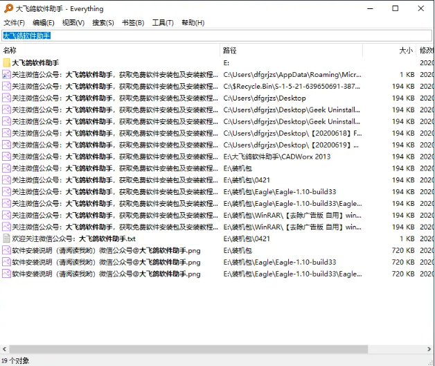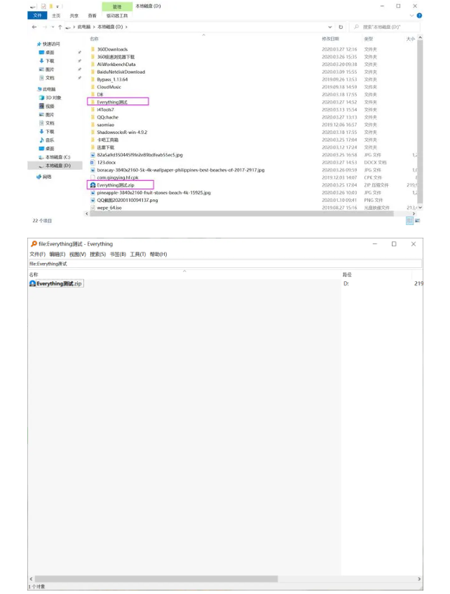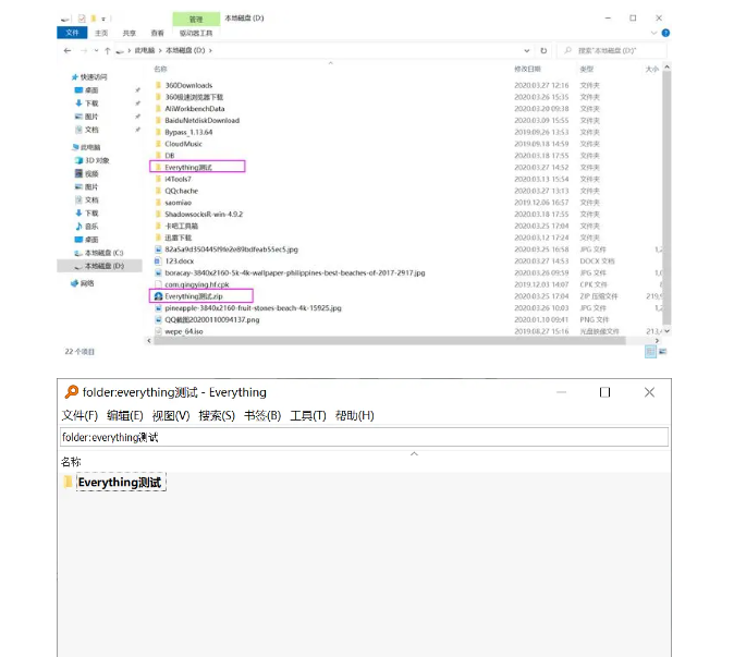 舉例:在D盤(pán)有一個(gè)名為“Everything測(cè)試”的壓縮包解壓出來(lái),我想再找到原壓縮包,在搜索欄輸入file:Everything測(cè)試,這樣搜索結(jié)果只會(huì)顯示文件而不會(huì)顯示文件夾。