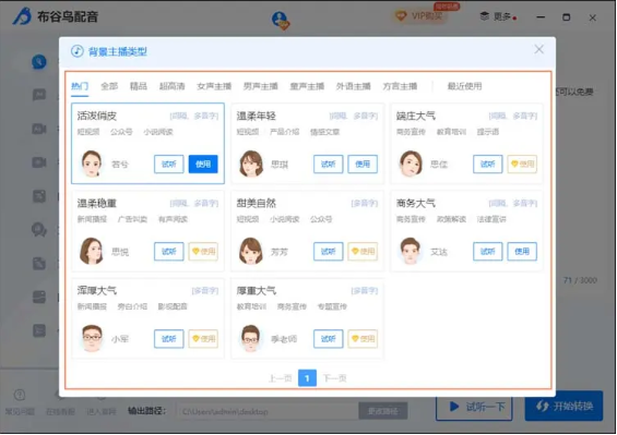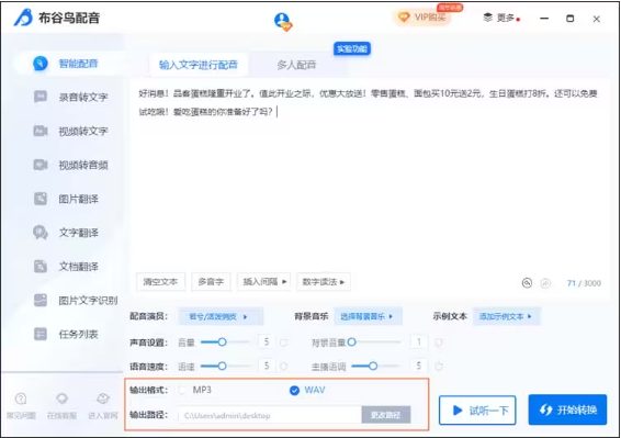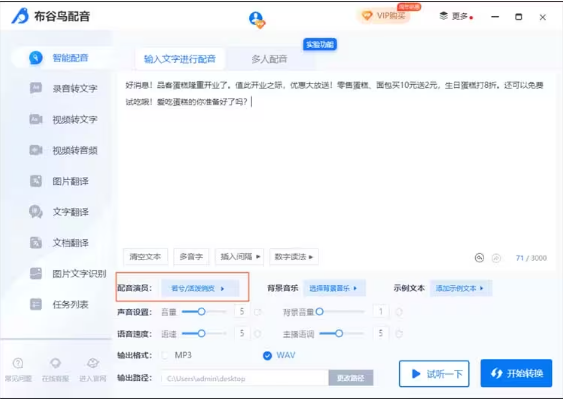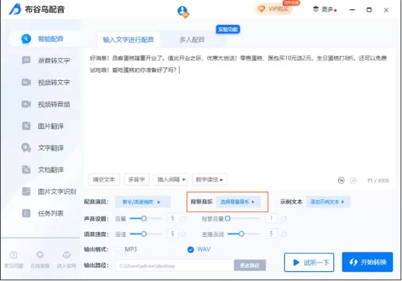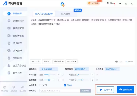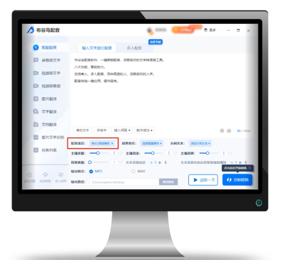 10、最后可以點(diǎn)擊“試聽一下”感受一下音頻的效果,確認(rèn)沒問題的話就可以點(diǎn)擊“開始轉(zhuǎn)換”進(jìn)行單人配音了。