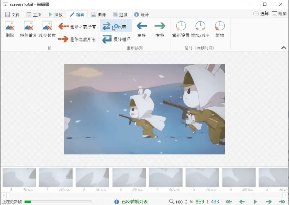 1.在編輯中有很多對幀的操作如:增加刪除、循環(huán)、反轉(zhuǎn),特別是移除重復(fù)幀功能,能很好的減小gif占用內(nèi)存大小;