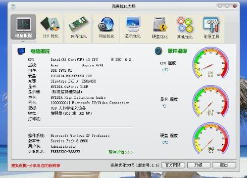 1.啟動完美優(yōu)化大師,首先進入的是系統(tǒng)信息總覽頁面。