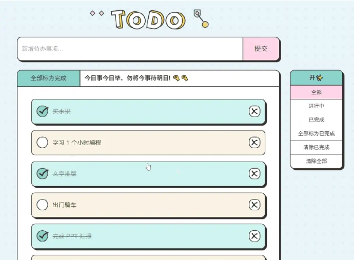 Todo清單作為一款跨平臺(tái)待辦事項(xiàng)與時(shí)間管理應(yīng)用,成為時(shí)間掌控者。它支持輸入待辦事項(xiàng),支持回車鍵和提交按鈕添加待辦事項(xiàng),支持雙擊添加的待辦事項(xiàng)進(jìn)行編輯,支持鼠標(biāo)拖拽待辦事項(xiàng)進(jìn)行排序。它支持將待辦事項(xiàng)標(biāo)記為已完成狀態(tài),支持刪除待辦事項(xiàng),支持回收站恢復(fù)刪除的待辦事項(xiàng),支持待辦事項(xiàng)篩選,包括:全部、進(jìn)行中、已完成,支持全部標(biāo)記為已完成、清除已完成、清除全部。
