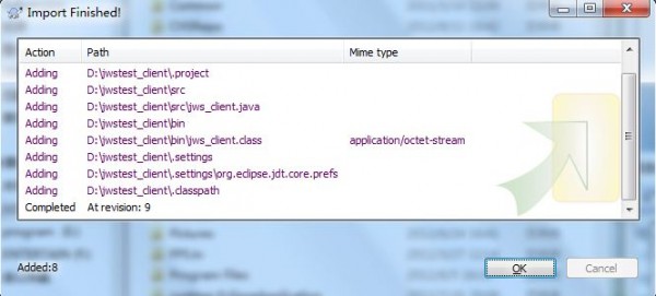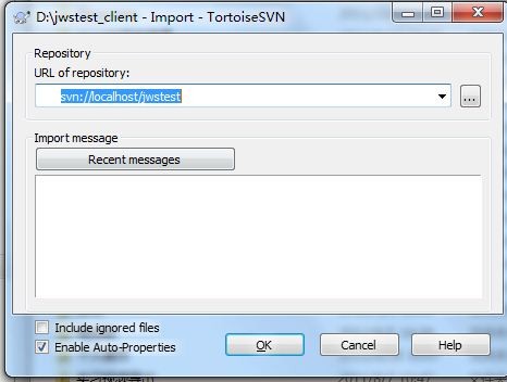 4.測(cè)試。任意右鍵點(diǎn)擊一個(gè)之前做的項(xiàng)目,這里我選擇了一個(gè)名為jwstest_client的項(xiàng)目,在彈出的上下文菜單中選擇tortoiseSVN->Import,出現(xiàn)如下界面: