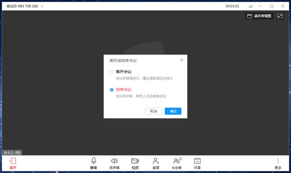 點擊[會議視窗]中左下角【離開】按鈕或右上角【X】按鈕,在提示彈窗中點擊【結(jié)束會議】即可結(jié)束會議;