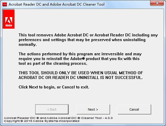 1.下載解壓打開 AdobeAcroCleaner_DC2015.exe,啟動(dòng) Adobe Reader and Acrobat Cleaner Tool 4.0.0,然后點(diǎn)擊 Next 按鈕: