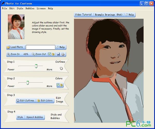 加載照片后,你可以通過(guò)選擇更平滑或更清晰的圖像改變它。您還可以選擇輸出圖像中更多或更少的細(xì)節(jié)。部分圖像可以被選擇以被合并或分割。如果你不快樂(lè)與原來(lái)的顏色,你可以使用一個(gè)調(diào)色板替換它們。如果你覺(jué)得你可以做的更多,你可以檢查出的視頻教程。你可以學(xué)習(xí)如何在幾分鐘的時(shí)間一個(gè)漂亮的卡通。輸出將被保存為JPG格式,并可以在紙上直接從程序打印。