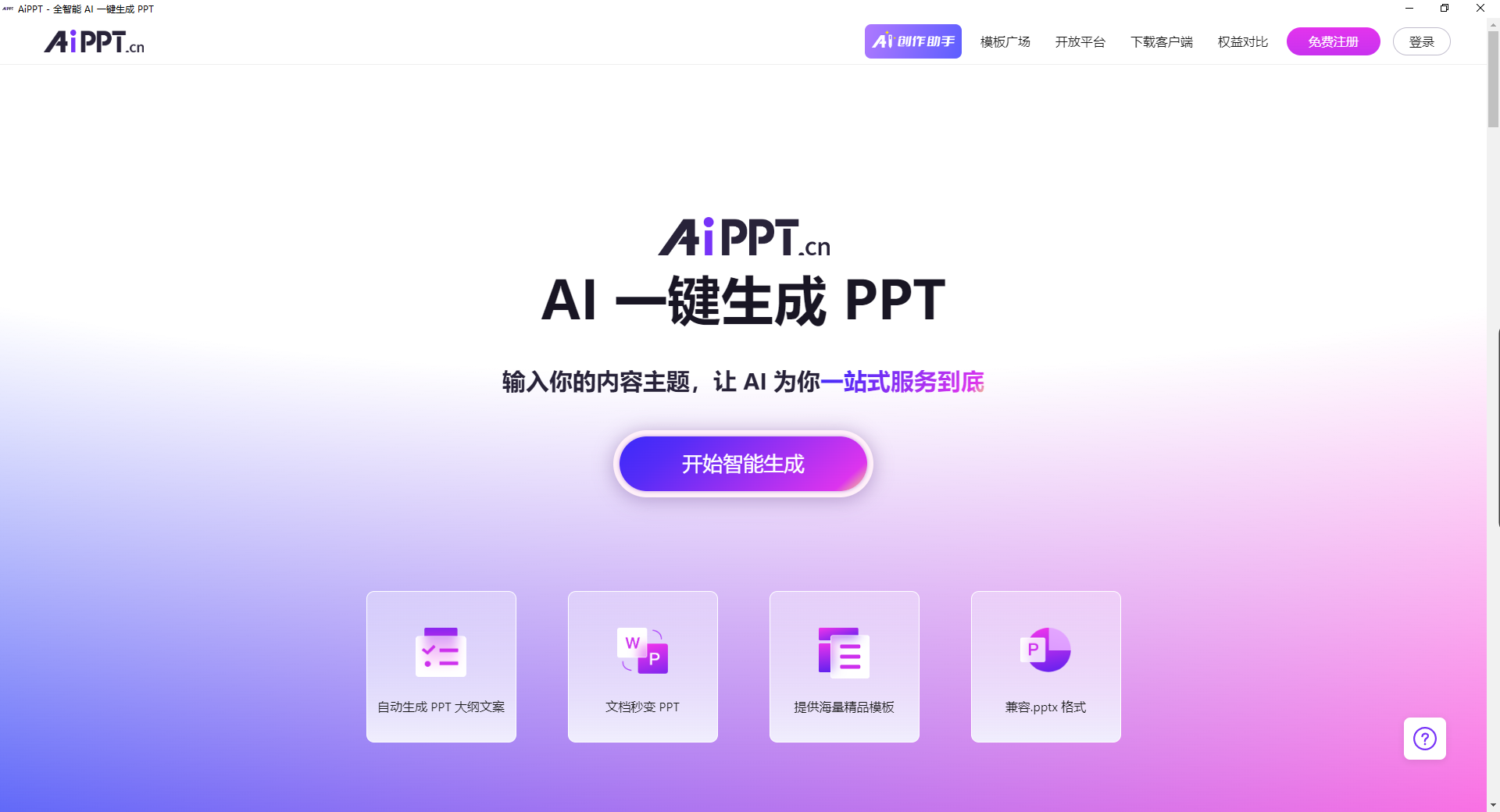 AiPPT是一個(gè)可以快速制作PPT文檔的軟件,AI賦能,一鍵式生成,讓辦公、學(xué)習(xí)中的PPT制作變得更加簡(jiǎn)單和輕松。支持PPT格式轉(zhuǎn)換,可以將WORD等辦公文檔轉(zhuǎn)換為PDF格式,為PPT制作提供了更符合需求的途徑。內(nèi)置大量PPT模板,可以任意修改生成的PPT樣式,使PPT變得更美觀。