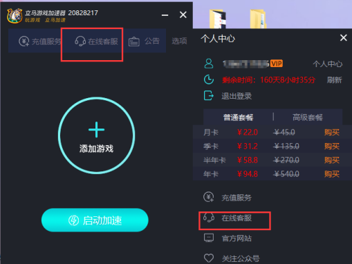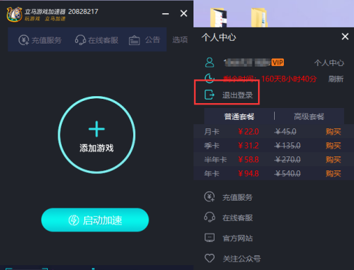 點(diǎn)擊選項(xiàng)按鈕,可以查看個(gè)人中心,剩余時(shí)間和套餐價(jià)格