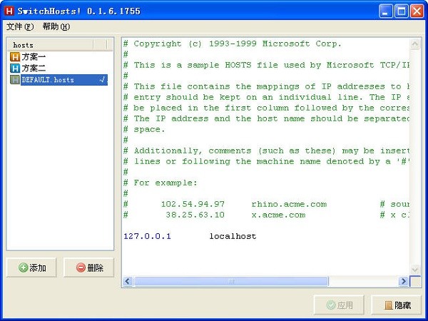 2011-09-15 發(fā)布 0.1.2 版,添加主面板,可以主面板上對(duì) hosts 進(jìn)行增加、刪除、編輯、重命名等操作。