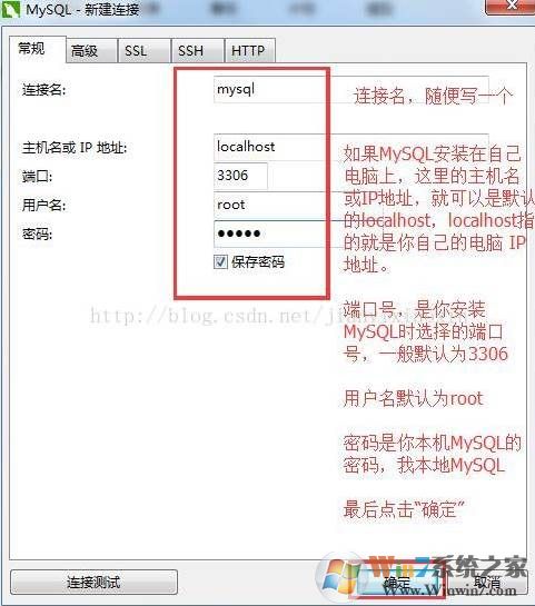 2、連接名稱隨便寫 然后輸入主機名或IP、端口、用衣名和密碼,點擊確定即可連接;不確定的用戶可以先點連接測試