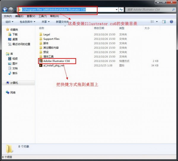 (圖十三)根據(jù)自己軟件的安裝路徑(安裝目錄)找到Adobe Illustrator Cs6【AI cs6】的快捷方式并把它拖到桌面上 如圖十三。
