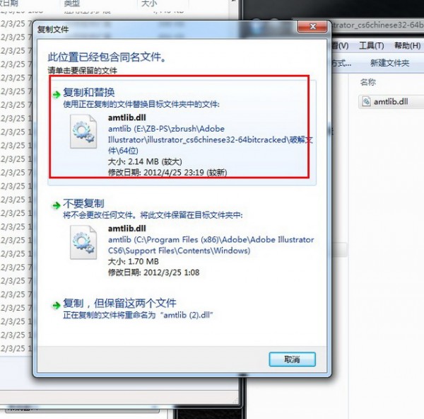 (圖十七)在我們復(fù)制文件到Adobe Illustrator Cs6【AI cs6】的安裝目錄里面時(shí)會(huì)彈出此界面,選擇“復(fù)制和替換” 如圖十七。