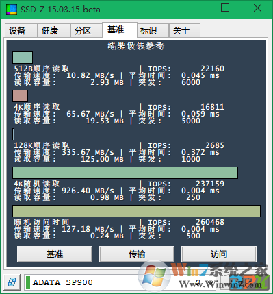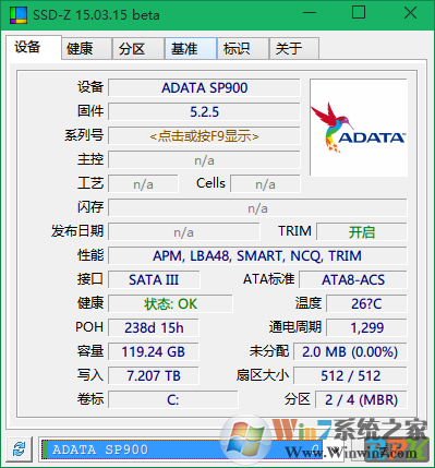 SSD-Z可以通過讀取硬盤固件中的信息,為你提供實時的硬盤健康狀態(tài)匯報,具體功能包括檢測設(shè)備信息、像 SSD 系列名稱、顆粒、芯片類型、接口、當(dāng)前溫度、SSD健康參數(shù)讀取、查看分區(qū)狀態(tài)、性能測試和設(shè)備診斷等