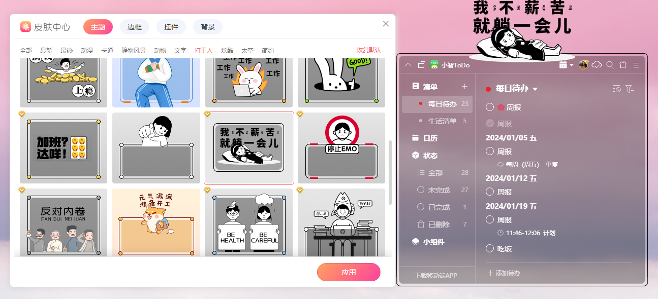 小智桌面日歷電腦版是一款實用的日歷、清單管理工具,占用內(nèi)存低,對性能消耗小,可以隨時使用,打開多個軟件也不會引起電腦卡頓。支持桌面小組件,可以方便地使用清單功能,創(chuàng)建各種分類待辦事項,還能從日歷中創(chuàng)建待辦并設(shè)置提醒。擁有超多待辦皮膚、天氣皮膚,使用戶界面更加美觀。