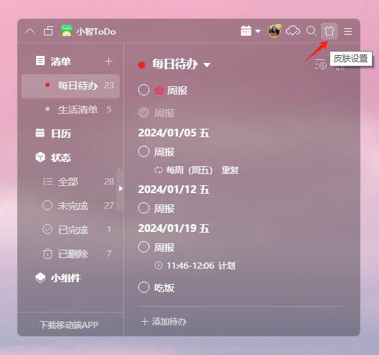 當(dāng)前版本中,點擊待辦界面右上角的“皮膚設(shè)置”按鈕,即可進(jìn)入皮膚中心。