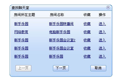點(diǎn)擊“確定”按鈕,系統(tǒng)將會(huì)自動(dòng)為您查找符合條件的房間,點(diǎn)擊其房間所在主題可以在大廳頁(yè)面部分顯示該區(qū)房間列表;點(diǎn)擊“收藏”可以將該房間添加到收藏列表中;點(diǎn)擊“進(jìn)入”即可直接進(jìn)入該房間。