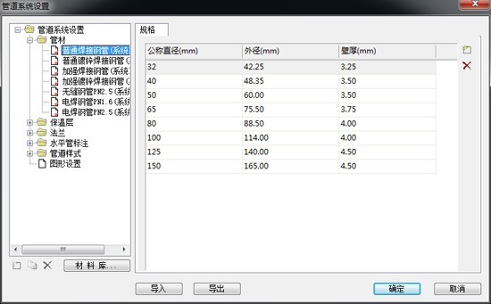 設(shè)置管道系統(tǒng)參數(shù),用于設(shè)置繪制管道過程中用到的管材、規(guī)格、保溫層、法蘭及標(biāo)注樣式。
