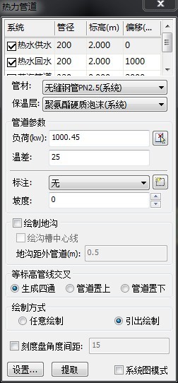 熱力管道:有熱水供水、熱水回水、蒸汽管道等多種管道可以繪制,其中可以設(shè)置管材、保溫層、負(fù)荷及坡度等信息。