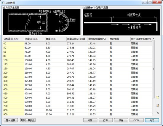 支持壁厚驗(yàn)算,管道應(yīng)力計(jì)算,彎頭應(yīng)力計(jì)算,固定墩推力計(jì)算,伸長量計(jì)算,穩(wěn)定性校核等目前直埋供熱管道工程技術(shù)規(guī)程所要求的所有計(jì)算。 計(jì)算嚴(yán)格按照最新版規(guī)程《城鎮(zhèn)供熱直埋熱水管道技術(shù)規(guī)程》(CJJ/T 81-2013)進(jìn)行,計(jì)算精確,結(jié)果可靠