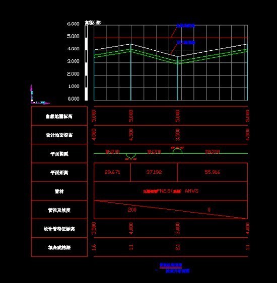 選取界面上的一段管道,根據(jù)走勢生成對應(yīng)的縱剖面圖,并且可以在剖面圖上面直接做調(diào)整,然后將調(diào)整好的剖面圖返回平面圖中,從而在剖面圖中解決了管道打架等可以發(fā)生的碰撞現(xiàn)象。 高級設(shè)置里面可以對縱斷面的繪制做詳細(xì)的設(shè)置,包括行間距,字高字寬及所要列出的表頭項(xiàng)。
