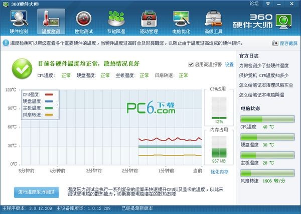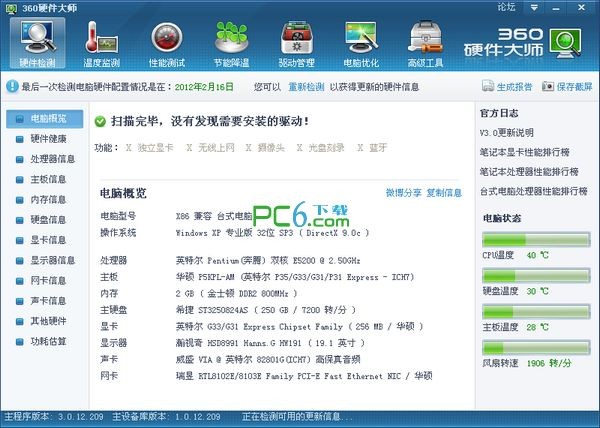 360硬件大師集成了電腦性能測(cè)試工具,是一款支持CPU、顯卡、內(nèi)存、硬盤,等設(shè)備硬件詳細(xì)信息的查看軟件,通過(guò)360硬件大師自帶的智能降溫功能確實(shí)可以降低電腦的問(wèn)題,自動(dòng)幫您降低5~10攝氏度的溫度完全不在話下;準(zhǔn)確的硬件檢測(cè)可以協(xié)助您辨別硬件的真?zhèn)?,不遠(yuǎn)你是電腦大師還是電腦小白,都可以用它!